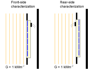 In production line environments, measurements of conventional solar cells and modules are standardly carried out with single-sided illumination. Therefore, several different procedures based on single-sided illumination have been transferred to bifacial solar devices. The most critical point is the consideration of the additional current that would be generated by illumination of the rear side.