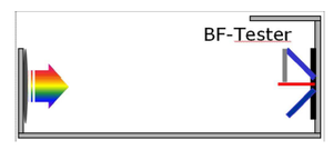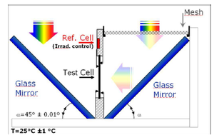 As alternative to setups with two different light sources, facilities with one light source and mirrors are in use for both-sided illumination of bifacial devices. Two mirrors are thereby applied to deflect the light of the solar simulator to the front and the rear of the bifacial device, which is mounted in parallel to the direction of light incidence (Figure 3). This approach has first been reported by [22] for small solar cells and transferred to large-area solar cells in 2008 [23]. The irradiance on the rear side of the bifacial device can thereby be reduced by inserting neutral density filters into the rear light path. Furthermore, the rear mirror can be replaced by different diffuse reflectors to simulate different albedo conditions [24].