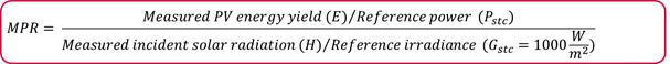 The energy yield performance of PV modules is commonly described by the Module Performance Ratio (short: MPR). MPR is a normalized parameter, which is independent of received irradiance (module orientation). It allows comparing PV modules measured at different sites, with different orientations or in different periods. It is calculated according to the formula: