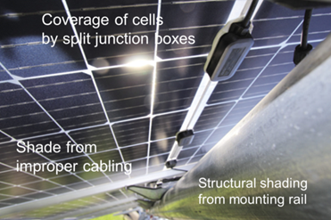 Figure 4: Rear view of a bifacial PV module with shading of cells caused by split junction boxes, cabling and mounting structure.