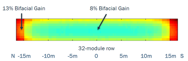 Figure 7: Variation of the bifacial gain for PV modules installed in a 32-module row and a short 4-module row [Deline2017]