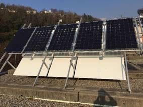 SUPSI was evaluating daily energy yield of bi-facial modules within the project ENHANCE funded by the Swiss Federal Office of Energy (SFOE). Three bi-facial modules were mounted on an open rack and the effect of rear panels as diffuse reflector was investigated as an alternative strategy to the classic white ground material. The rear surfaces were placed to simulate rooftops or wall reflectors for potential applications into the built environment. The test bench in Figure 11 was designed considering the best practice guidelines reported in IEA‐PVPS T13‐11:2018. The height of the test samples was defined at least one meter above the ground and 10 centimeters from any other object in order to promote the air circulation around the modules and minimize temperature gradients. Additional dummy modules on the left and right of the row were placed to reduce the heat propagation by convection mechanism in these module locations. A mono-facial module of the same technology was mounted as a reference beside the bifacial modules. Four pyranometers were placed around each bi-facial module to determine the irradiance non-uniformity on the back side. The temperature in the back of the modules was measured in three in different positions with PT100 sensors. The hardware solutions used for the measurement of the module power combines IV‐tracing (IV) performed in regular intervals while the module is otherwise operated at its maximum power by means of maximum power point trackers (MPPT).