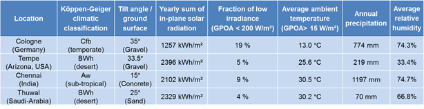 All test sites are equipped with identical hardware and offer the possibility to perform comparative energy yield measurements of up to 30 PV modules. The PV modules are open rack mounted in a row. Continuous maintenance measures (cleaning, annual calibration of measurement equipment, annual replacement of sensors) ensure a high data availability of more than 90%. Table 1 gives some technical details of the test instrumentation.