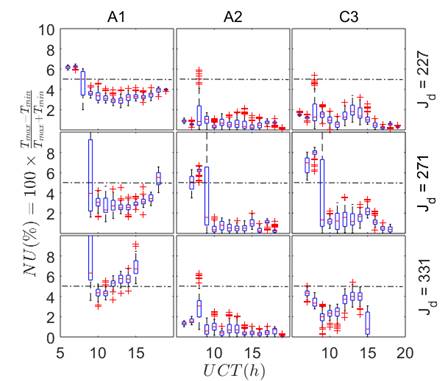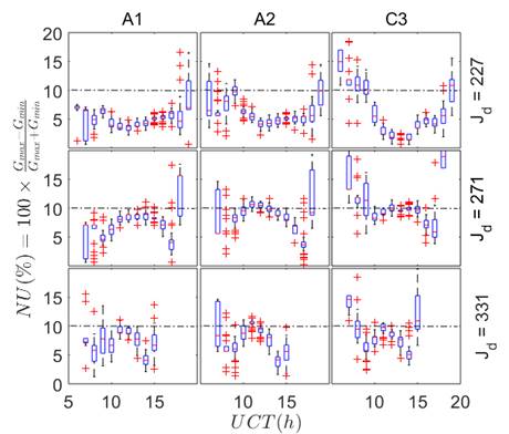 accounts for the maximum and minimum irradiances respectively. Figure 12 displays a box plot matrix of non-uniformities measured in the rear side of the modules 16-113-A1, 16-074-A2 and 16-074-C3, corresponding to columns A1, A2 and C3 respectively. Each of the three rows in the matrix corresponds to day numbers 227, 271 and 331 of the 2018 Julian date calendar. On each box, the central red mark indicates the median, and the bottom and top edges of the box indicate the 25th and 75th percentiles, respectively. The whiskers extend to the most extreme data points not considered outliers, and the outliers are plotted individually using the '+' symbol.