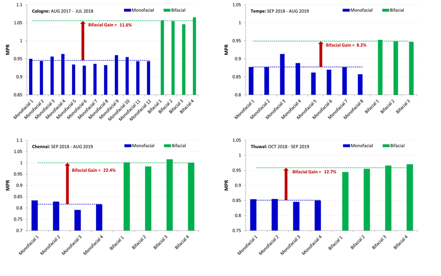 Figure 10: Results of the comparative energy yield test of monofacial and bifacial PV modules at TÜV Rheinland PV-CLIMATE test sites [Bonilla 2019]