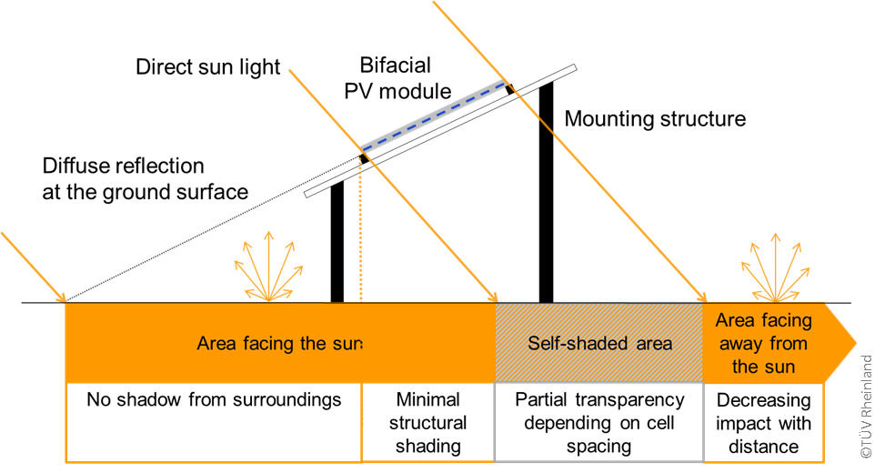 This area is given by the direct shadowing of the module onto the ground surface, which is caused by direct sunlight. Depending on the cell spacing in the module, a fraction of incoming sunlight is transmitted, but will normally play a minor role for the rear face irradiance.